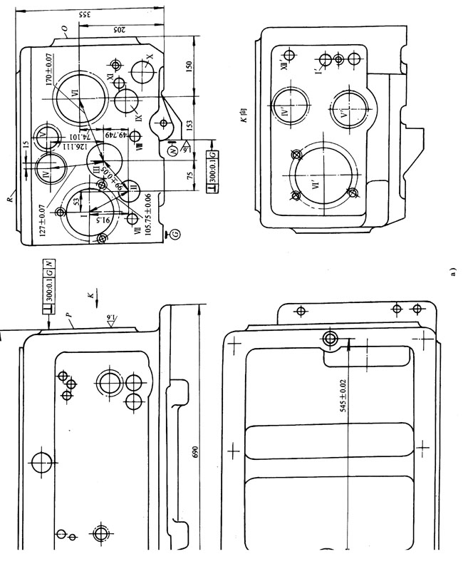 導(dǎo)向支承可以直接固定在夾具體上,夾具剛度好,有利于保證孔系加工的位置精度,且裝卸方便,便于組織生產(chǎn)流水線和實(shí)現(xiàn)情動化生產(chǎn),適用于大批大量生產(chǎn)。但這種定位方案也有不足之外,如在加工過程中無法觀察加工情況,無法測量孔徑和調(diào)整刀具,因而要求采用定尺寸刀具直接保證孔的精度,須相應(yīng)提高頂面R至底面M的尺寸加工精度,同時,兩定位銷孔,圖樣上為主軸孔的沒孔,其精度不高,也提高加工精度。