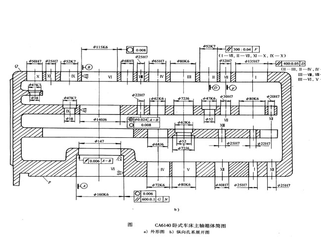 現(xiàn)以車床主軸箱箱體為例,進(jìn)一步說明這些原則的具體應(yīng)用。CA6140車床主軸箱箱體零件簡圖如圖所示