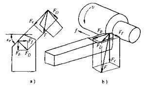 (1) 切削力的產(chǎn)生與切削力的分解 切削加工時(shí),在刀具的作用下,被切削層金屬、切屑和工件已加工表面金屬都要產(chǎn)生彈性變形和塑性變形,這些變形所產(chǎn)生的抗力分別作用在前刀面和后刀面上:同時(shí),由于切屑沿前刀面流出,刀具與工件之間有相對(duì)運(yùn)動(dòng),所以還有摩擦力作用在刀面和后刀面上。這些作用在刀具上的合力就是總切削力F,簡(jiǎn)稱(chēng)切削力。
