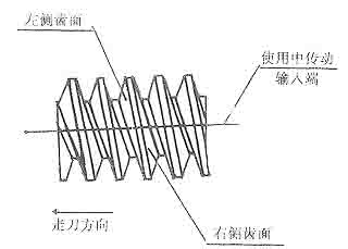 車蝸桿時(shí)由于螺旋升角的影響,輪齒右側(cè)齒面切削條件好,左側(cè)切削條件差。并且車左側(cè)齒面時(shí)車刀所受軸向切削力與走刀方向相同(見圖2),所以切削不平穩(wěn),齒形誤差比右側(cè)大。再如果滾蝸輪時(shí)滾刀桿的軸承間隙大,加工時(shí)產(chǎn)生讓刀,這樣蝸輪蝸桿嚙合時(shí)蝸輪輪齒一側(cè)接觸好,一側(cè)接觸差。因此在運(yùn)轉(zhuǎn)初期建議旋轉(zhuǎn)方向:從輸入端看蝸桿順時(shí)針方向旋轉(zhuǎn),蝸輪旋轉(zhuǎn)方向與加工時(shí)相同(見圖1),反方向旋轉(zhuǎn)只能短時(shí)使用。