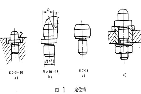 圓1為常用定位銷的結(jié)構(gòu)。當(dāng)工件孔徑較。―=3-10)時(shí),為增加定位銷剛度,避免銷子因受撞擊而折斷,或熱處理時(shí)淬裂,通常把根部倒成圓角。這時(shí)夾具體上應(yīng)有沉孔,使定位銷的圓角總分沉入孔內(nèi)而不會(huì)忍礙定位。大批大量生產(chǎn)時(shí),為了便于定們銷的更換,可采用圖1d為常用 定位銷的結(jié)構(gòu)形式。為便于工件湎利裝入,定位銷的頭部應(yīng)有150倒角。