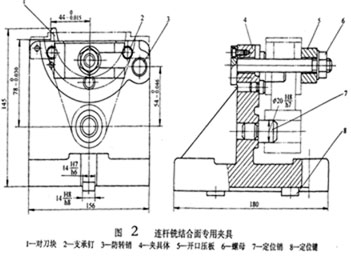 (1) 連桿銑給合面專用夾具,如圖2所示,工件以底面及φ20H8孔在三個(gè)支承釘2及定位銷7上定位,防轉(zhuǎn)銷3限制工件轉(zhuǎn)動(dòng)。擰緊螺母6,通過開口壓板5夾緊工件。