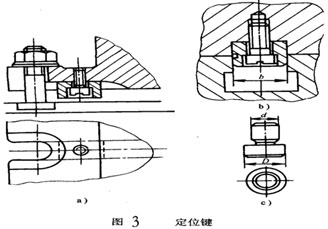 定位鍵有矩形和圓形兩種,圓形定位鍵(如圖4C所示)補(bǔ)償貿(mào)易加工,便較易磨損,故用得不多。矩形定位鍵有兩種結(jié)構(gòu)形式,一種在鍵的側(cè)面開有溝槽或臺(tái)附(圖4b),把鍵分為上、下兩部分,其上部按H7/h6與夾具體底面上的槽或臺(tái)附。下部與多才多藝床工作臺(tái)上的T形槽配合。因工作臺(tái)T形槽的公差為H8或H7,故尺寸b按h8或h6制造,以減少配合間隙,提高定向精度。另一種鍵為矩形(圖4)上下兩部分尺寸相同,它適用于定向烳工度要求不高的夾具。