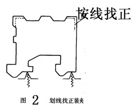 引法是先在毛坯上按照零件圖劃出中心線、對稱線和各等加工表在的加工線,然后將工件裝上機(jī)床,按照劃好的線找正工件在要床上的裝夾位置。如圖2所示車床床身毛坯,為保證床身各種壁厚均勻及各加工面的加工余量,先在平臺上將毛坯按圖劃好加工線,然后在龍門刨床工作臺上用千斤頂支起床身毛坯,用劃線盤按線的正后夾緊,再對床身毛坯底平面進(jìn)行粗刨。這種裝夾方法生產(chǎn)率低,精底低,且對工人技術(shù)水平要求高,一般用于單件小批生產(chǎn)中加工復(fù)雜而笨重的零件,或毛坯尺寸公差大而無法直接用來具裝夾的場合。