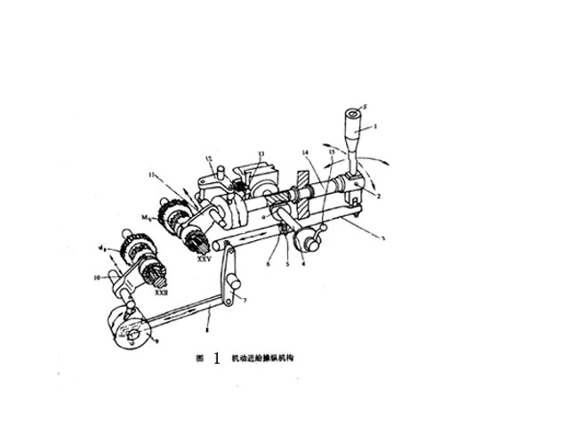 1、 縱向、橫向機(jī)動進(jìn)給及快速移動是由一個手柄集中操縱圖1,當(dāng)需要縱向移動刀架時,向相應(yīng)方向(向左或向右)扳動手柄1.而操縱手柄1只能繞銷1擺動,于是手柄1下部的開口槽就撥動軸3軸向移動。軸3通過杠桿及7及扒桿8使鼓形凸輪9轉(zhuǎn)動,凸輪9的曲線槽迫使撥叉10移動,從而操縱軸ⅩⅩⅡ上的牙嵌式雙向離合器M8向相應(yīng)方向嚙合。這時如光杠軸號ⅩⅩⅡ轉(zhuǎn)動,運(yùn)動傳給軸ⅩⅩ,從而使刀架作縱向機(jī)動進(jìn)給;如按下手柄1上端的快速移動按鈕s快速電動機(jī)起動,刀架就可向相應(yīng)方向快速移動,直到松開快速移動按鈕時為止。如向前或向后扳動操縱手柄1,可通過軸14使鼓形凸輪13轉(zhuǎn)動,凸輪13上的曲線槽迫使杠桿12擺動,杠桿12又通過拔叉11撥動軸ⅩⅩⅡ上的牙嵌式雙向離合器M9向相應(yīng)向方嚙合。這時,如接通光杠或快速電動機(jī)就可使橫刀架實(shí)現(xiàn)向前或向后的橫向機(jī)動進(jìn)給或快速移動.操給手柄1處于中間位置時,離合器M8和M9脫開,這時機(jī)動進(jìn)給及快速移動均被斷開。