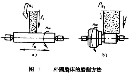 用中心磨床磨削外圓柱面時,基本的磨削方法有兩種:縱磨法和切入磨法。見圖1。