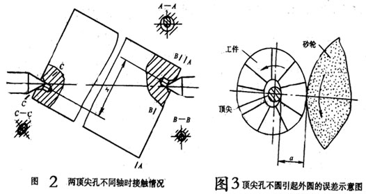 (3)s頂尖孔的圓度 頂尖孔不加將直接反映出工件磨后的誤差。圖3所示,頂尖孔不賀,磨削時因磨削力將工件推向一方,而砂輪與頂尖保持不變的跑離a,因此,工件外圓形狀取決于枯尖孔的形狀,頂尖孔圓度誤差直接反映到工件外圓上。