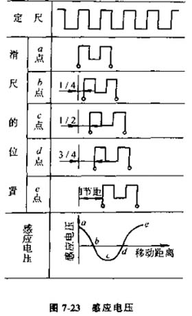 圖7-23所示為滑尺在不同位置時(shí)定尺上的感應(yīng)電壓,當(dāng)定尺與滑尺繞組重合時(shí),如圖中a點(diǎn),這時(shí)感應(yīng)電壓最大。當(dāng)滑尺相對(duì)于定尺平行移動(dòng)后,感應(yīng)電壓便逐漸減小,在錯(cuò)開1/4節(jié)距的b點(diǎn)時(shí)感應(yīng)電壓為零。再繼續(xù)移動(dòng)到1/2節(jié)距的c點(diǎn)時(shí),得到的電壓值與a點(diǎn)位置相同,但極性相反,隨后感應(yīng)電壓在3/4節(jié)距位置d點(diǎn)時(shí)又變?yōu)榱悖谝苿?dòng)一個(gè)節(jié)距到e點(diǎn)時(shí),電壓幅值與a點(diǎn)位置相同。這樣滑尺在移動(dòng)一個(gè)節(jié)距的過(guò)程中,感應(yīng)電壓變化了一個(gè)余弦波形。由此可見,在激磁繞組中加上一定的交變激磁電壓,感應(yīng)繞組中就產(chǎn)生相同頻率的感應(yīng)電壓,其幅值大小隨著滑尺移動(dòng)作余弦規(guī)律變化;咭苿(dòng)一個(gè)節(jié)距,感應(yīng)電壓變化一個(gè)周期,感應(yīng)同步器就是利用這個(gè)個(gè)感應(yīng)電壓的變化來(lái)進(jìn)行位置檢測(cè)的