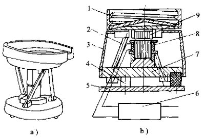 (1)       振動(dòng)式料斗的運(yùn)動(dòng)特點(diǎn)圖60-1的振動(dòng)式料斗由電磁力作為驅(qū)動(dòng)力。當(dāng)電磁達(dá)到最大值時(shí),街鐵9被吸下,帶動(dòng)料斗1,同時(shí)三片沿圓周方向分布的彈簧2變形。電磁力消失時(shí)街鐵放開,彈簧復(fù)原。彈簧的變形,復(fù)原過程中,料斗1既作上下運(yùn)動(dòng),又作扭轉(zhuǎn)運(yùn)動(dòng),使零件從低部沿螺旋軌道上升,在料斗內(nèi)座上布置的定向裝置對(duì)零件作定向整理。正確定向的零件從料斗上部的出料口進(jìn)入輸聊管道。