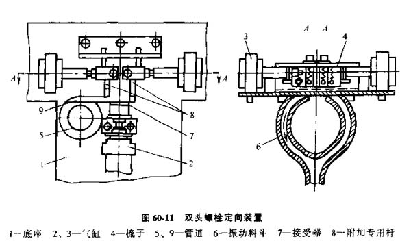 圖60-11中雙頭螺栓從振動料斗6沿管道9前進(jìn)。在此雙頭螺栓之前,另有一個雙頭螺栓從振動料斗進(jìn)入氣缸2推動的供料接受器7,前一螺栓被后一螺栓的桿身或由接受器7的附加轉(zhuǎn)用桿隔離。移動的雙頭螺栓由兩個彈簧作用的梳子供料。氣缸2在前面位置停下來后,氣缸3接通,將梳子4向兩個不同方向分開。一對梳子均帶有齒頂不尖的雙頭螺栓,其中一個梳子處于同雙有螺栓的螺紋嚙和狀態(tài),另一個梳子沿著螺距較小的螺紋梳子面滑動。移動時,雙頭螺栓將滑入底座1的橢圓窗孔并沿著接受槽(即管道5)進(jìn)入螺栓搬運器,在進(jìn)入旋緊螺栓的工作機(jī)構(gòu)。第二個梳子由于螺距不同,不能與雙頭螺栓端部螺紋嚙合,因而停留在螺紋表面上。作為例外(當(dāng)螺栓直徑和質(zhì)量較大時),梳子螺紋和螺栓螺紋相同,但可能與螺栓不重合。但當(dāng)油缸活塞桿開始運動時,梳子就一定能與螺栓螺紋想嚙合。當(dāng)螺栓進(jìn)入梳子面下時,雙頭螺栓在梳子牙條傾斜角作用下轉(zhuǎn)動,因此牙條與雙頭螺栓相嚙合始終不少于三個牙;而另一雙頭螺栓不進(jìn)行嚙合。