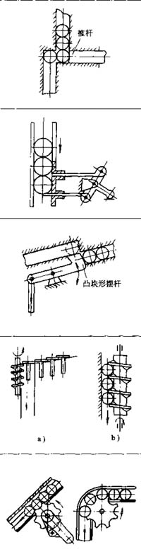 往復(fù)擺動的凸塊形擺桿擺入時推出一個零件至待取出位置,擺出時零件落到待推位置,改變凸塊及輸料槽結(jié)構(gòu)可一次推出多個零件 |