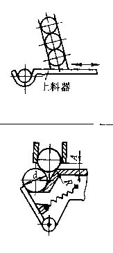 帶溝槽的推桿往復(fù)運(yùn)動(dòng),在上料的同時(shí)兼作零件的隔離。推桿運(yùn)動(dòng)到工作公位時(shí),其上面的平面封住料槽;從工作工位退回時(shí),零件落入推桿上的溝槽 |