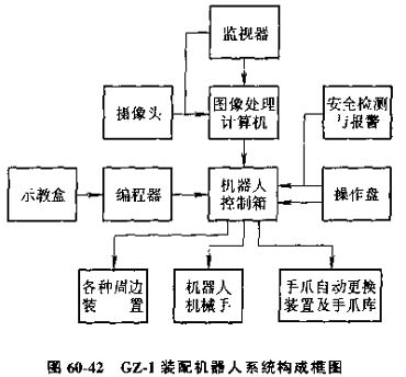 我國(guó)研制CZ-1型高速精度智能裝配機(jī)器人是一種可帶視覺(jué)的SCARA型機(jī)器人,具有由直流伺服電動(dòng)機(jī)驅(qū)動(dòng)的四個(gè)自由度。其基本結(jié)構(gòu)框見(jiàn)圖60-42。各部分的功能為: