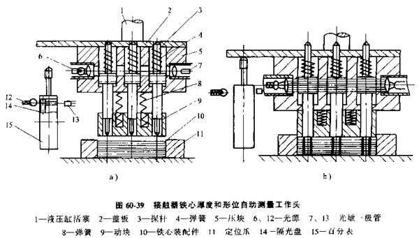 1) 接觸器鐵心綜合檢測工作頭,圖60-39a中為原始位置,測量開始時,崖壓缸活塞1下降,動塊9在彈簧4作用下壓向鐵心裝配件10,將松散的鐵心片壓緊,同時由定位爪11定位。隨著崖壓缸活塞1繼續(xù)下降,6根探桿3插入鐵心裝配件10的鉚釘孔內(nèi),然后壓塊5與動塊9接觸并壓向鐵心裝配件10。同時蓋板2與百分表15的觸頭接觸,測量鐵心厚度。觸頭每移動1mm,隔光盤14旋轉(zhuǎn)一周,光源12發(fā)出的平行線透過隔光盤14上的小孔,給光敏三極管發(fā)出10個信號,輸入控制系統(tǒng)。