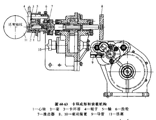 卡環(huán)的成形機構及向活塞槽安裝卡環(huán)的機構,圖60-63所示機構的主要元件是柱形心軸1、不轉(zhuǎn)動的套2、推出器7和輥子4。心軸1上開有徑向槽,可以旋轉(zhuǎn),形狀為徑向槽開始并沿其回轉(zhuǎn)進程直徑逐漸變小的錐體。套2與心軸同軸并形成一個環(huán)形間隙,當卡環(huán)毛坯一端被卡在心軸的徑向槽中時,在環(huán)形間隙中加工出卡環(huán)的毛坯。套形推出器的外徑等于活塞上孔的直徑,安裝在環(huán)形間隙中并與心軸用鍵聯(lián)接,同時與帶軸向移動和轉(zhuǎn)動的驅(qū)動裝置10和8相連。輥子4位于把卡環(huán)3壓向心軸軸線的軸上,并通過傳動比為1的齒輪6與心軸相連接。輥子的外形逐步增大。