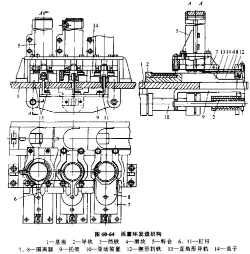 向滑塊上自動發(fā)送活塞環(huán)的機構,圖60-64機構有一個基座上緊固著逐個發(fā)送活塞環(huán)的料倉5和杠桿6,在垂直于料倉中心線的平面內(nèi)鉸接并用彈簧相互拉緊,還帶有形狀與被夾持的活塞環(huán)相似的輥子鉗口,以及在料倉下垂直其中心線的并在平面內(nèi)能移動的隔離器7和8推板做成托架9的形式,并帶有強制性驅(qū)動裝置10,推板沿導軌2移動,用杠桿11與滑塊4相互作用,滑塊上固定隔離器7和8以及楔形擋鐵12,在滑塊工作行程末端與彈簧杠桿6相互作用;瑝K連同不動的固定隔離器可以在固定于基座上的直角形導軌13內(nèi)移動。隔離器上面用蓋子14蓋住,靜止地架在直角形導軌13上面