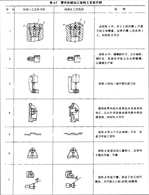 表4-7 列舉了零件機械加工結(jié)構(gòu)工藝性對比的一些典型實例,可供分析零件結(jié)構(gòu)的加工工藝性時參考。