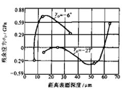 1) 刀具方面,當(dāng)前角由正值逐漸變?yōu)樨?fù)值時,表層的殘余拉應(yīng)力逐漸減小,但殘余應(yīng)力層的深度增大(見圖3-5)在一定的切削用量下,采用絕對值較大的負(fù)前角,可使已加工表面層得到殘余壓應(yīng)力(見圖3-6)