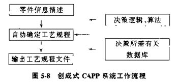(1)基本原理。創(chuàng)成式CAPP系統(tǒng)的工作原理與派生式不同,在系統(tǒng)中沒有事先設(shè)定的標準工藝規(guī)程。創(chuàng)成式CAPP系統(tǒng)中儲存的是工藝人員設(shè)計工藝過程時所用的大量工藝數(shù)據(jù)及推理邏輯和決策方法。當(dāng)輸入一個新零件的有關(guān)信息后,系統(tǒng)可以模擬工藝人員,在沒有人工干預(yù)的情況下,自動地生成零件的工藝過程。創(chuàng)成式CAPP系統(tǒng)的工作流程如圖5-8所示。