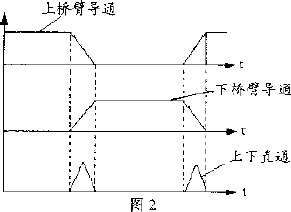 在小車動(dòng)作的過(guò)程中,我們要不斷 地使電機(jī)在四個(gè)象限之間切換,即在正 轉(zhuǎn)和反轉(zhuǎn)之間切換,也就是在S1、S2導(dǎo)通且S3、S4關(guān)斷,到S1、S2關(guān)斷且S3、 S4導(dǎo)通,這兩種狀態(tài)之間轉(zhuǎn)換。在這種 情況下,理論上要求兩組控制信號(hào)完全互補(bǔ),但是,由于實(shí)際的開(kāi)關(guān)器件都存在 開(kāi)通和關(guān)斷時(shí)間,絕對(duì)的互補(bǔ)控制邏輯 必然導(dǎo)致上下橋臂直通短路,比如在上橋臂關(guān)斷的過(guò)程中,下橋臂導(dǎo)通了。這個(gè)過(guò)程可用圖2說(shuō)明。