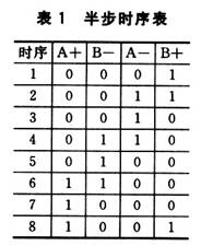 步進(jìn)電機(jī)有兩種工作方式:整步方式和半步方式。以步進(jìn)角1.8°四相混合式步進(jìn)電機(jī)為例,在整步方式下,步進(jìn)電機(jī)每接收一個(gè)脈沖,旋轉(zhuǎn)1.8°,旋轉(zhuǎn)一周,則需要2OO個(gè)脈沖。在半步方式下,步進(jìn)電機(jī)每接收一個(gè)脈沖,旋轉(zhuǎn)0.9°,旋轉(zhuǎn)一周,則需要4OO個(gè)脈沖?刂撇竭M(jìn)電機(jī)旋轉(zhuǎn)必須按一定時(shí)序?qū)Σ竭M(jìn)電機(jī)引線輸入脈沖。以上述四相六線制電進(jìn)電機(jī)為例,其半步工作方式和整步工作方式的控制時(shí)序如表1和表2所列。