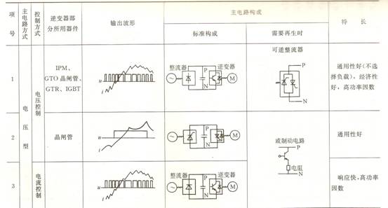 表1將實(shí)用化的變頻器按主電路方式、控制方式等分類。各種方式的組合是為了充分發(fā)揮其控制特 性、適用電動(dòng)機(jī)、容量范圍、經(jīng)濟(jì)性等特點(diǎn)而設(shè)計(jì)制造的。