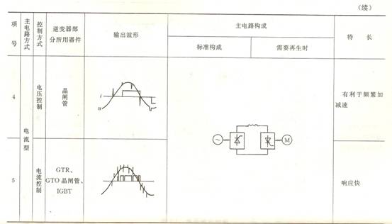 表1中項(xiàng)5的電流型晶閘管變頻器,在逆變器側(cè)控制頻率,在整流器側(cè)控制電流。該表中項(xiàng)3,用晶體管和GTO晶閘管構(gòu)成的電壓型變頻器則適用這樣的電流控制方式,利用逆變器側(cè)的導(dǎo)通率將輸出電流控制成為正弦波。
