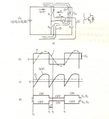 現(xiàn)在,使開關(guān)S1、S2導(dǎo)通,由直流電壓源Ed沿圖a中①路線供給負(fù)載電流i。在時(shí)刻t1使這兩個(gè)開關(guān)關(guān)斷,同時(shí)使開關(guān)S3、S4導(dǎo)通,于是負(fù)載的無功功率就沿②路線反饋給直流電壓源Ed。