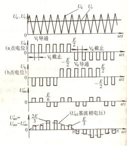 輸出的相電壓波形每半個(gè)周期出現(xiàn)6個(gè)等寬等距脈沖,中間兩個(gè)脈幅高(2E/3)兩邊4個(gè)脈幅低(E/3),正負(fù)半周對(duì)稱,這個(gè)脈沖波形可以分解為基波電壓U1和一系列諧波電壓,基波電壓就是要求輸出的交流電壓,而諧波電壓分量愈小愈好。