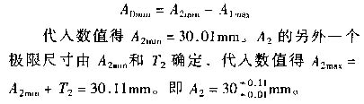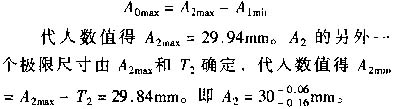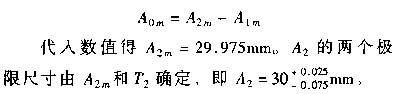 當(dāng)以M為修配面時(shí),修配后A2變小,從而Ao也變小,對(duì)于一個(gè)偏大的A2值,可以通過(guò)修配使之變小。但A2過(guò)大則修配量大。由于一個(gè)偏小的A2值,無(wú)法通過(guò)修配M面來(lái)保證修配精度。因此,為了保證足夠的但又是最小的修配量,對(duì)修配使封閉環(huán)變小的場(chǎng)合,應(yīng)該令修配前、后環(huán)的最小尺寸相等,并由此解出修配環(huán)的一個(gè)極限尺寸: