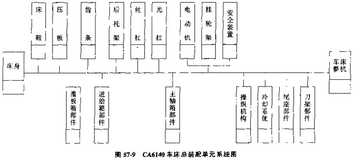裝配單元系統(tǒng)圖(圖57-9)直觀(guān)地表示出產(chǎn)品的劃分及其裝配順序。習(xí)慣上先繪出一條永橫線(xiàn),在橫線(xiàn)的左端繪出代表基準(zhǔn)件的長(zhǎng)方格,右端繪出代表產(chǎn)品的長(zhǎng)方格。圖中每一零、部件都用長(zhǎng)方格表示,方格中可以注明裝配單元的名稱(chēng)、數(shù)量和編號(hào)。將零件繪在橫線(xiàn)上面,部件繪在橫線(xiàn)下面。