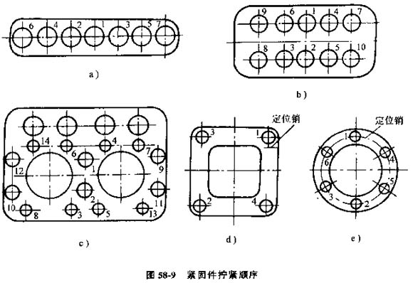 3)同一零件用多個螺釘或螺栓緊固時,各螺釘或螺栓需按一定順序逐步擰緊,如有定位銷,應從靠近定位銷的螺釘或螺栓開始,見圖58-9。