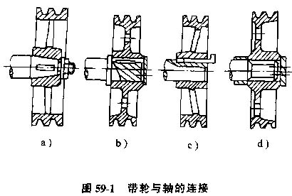 帶輪孔與軸一般采用過渡配合(H7/K6),有少量過盈,對(duì)同軸度要求較高。為了傳遞較大的轉(zhuǎn)矩,需用鍵和緊固件進(jìn)行周向,軸向固定,圖59-1所示為帶輪在軸上的集中固定方式。