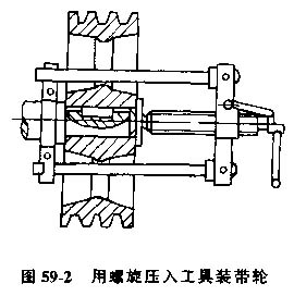 A) 圓錐軸頸,擋圓軸向固定,b)軸肩、擋圓軸向固定,c)楔鍵周向、軸向固定,d)隔套、擋圈軸向固定安裝帶輪前,先按軸的軸轂孔的鍵槽修配鍵,然后清理安裝面并涂上潤(rùn)滑油。用木錘或銅棒將帶輪輕打到軸上,或用螺旋等壓入工具將帶輪壓到軸上,見圖59-2。