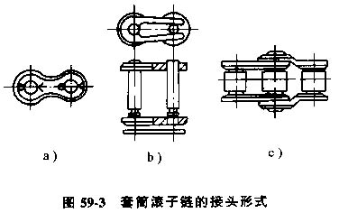 套筒滾字鏈的接頭形式見圖59-3所示。圖59a為用開口銷固定活動銷軸,圖59-3b為用彈簧卡片固定活動銷軸,這兩種方法都用于鏈條節(jié)數(shù)為偶數(shù)。用彈簧卡片時要注意使開口端方向與鏈條的速度方向像反,以防在運轉(zhuǎn)中脫落。圖59-3c為采用過渡鏈節(jié)結(jié)合,用于鏈條節(jié)數(shù)為奇數(shù)。