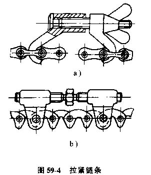 當兩輪中心距離可調(diào)且鏈輪在軸端時,可以將鏈條兩端預(yù)先接好,再裝到鏈輪上,如果受結(jié)構(gòu)限制,只能先將鏈條套在鏈輪上再進行連接,此時可以采用專用的拉緊工具,見圖59-4。