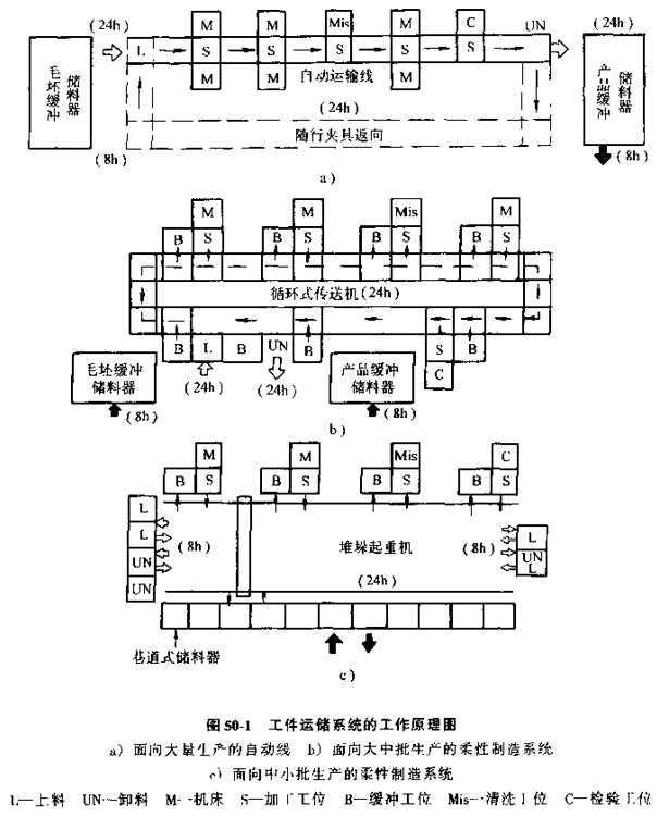 工件在制造系統(tǒng)中的流動(dòng)是輸送和存儲(chǔ)兩種功能的有機(jī)結(jié)合。運(yùn)輸和存儲(chǔ)兩種功能的合理配置是為了使整個(gè)制造系統(tǒng)的協(xié)調(diào)運(yùn)行,避免因運(yùn)行失調(diào)而造成生產(chǎn)率損失。圖50-1所示的是幾種類型自動(dòng)化制造系統(tǒng)的物料儲(chǔ)運(yùn)系統(tǒng)的工作原理圖。