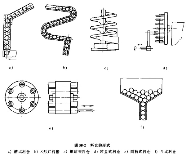 表50-1列出了典型的料斗形式,適用工件以及技術(shù)特性,供選擇定向方法和確定料斗機構(gòu)時參考。