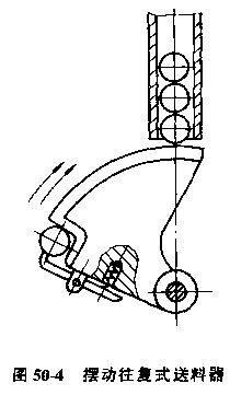 b.擺動式送料器,圖50-4是帶動式送料器,其搖臂上面為工件止動面,兼有隔料作用。擺臂運動可由氣壓、液壓、機械傳動。擺動式送料器結(jié)構(gòu)比直線簡單,不需較長的滑動導(dǎo)軌,節(jié)省空間,送料速度快。