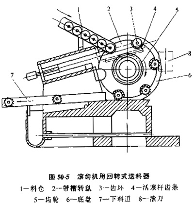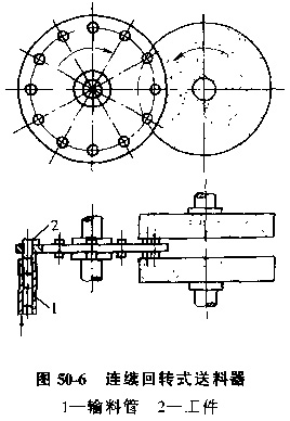 A.回轉(zhuǎn)式送料器,圖50-5是滾齒機上用的回轉(zhuǎn)式送料器,當帶狗槽的轉(zhuǎn)盤旋轉(zhuǎn)時,槽口順次經(jīng)過料倉的靠口處,單個工件落入槽口。轉(zhuǎn)盤外圓柱面為工件止動面兼隔料作用。隨著轉(zhuǎn)盤的間歇轉(zhuǎn)動,坯料被送到加工工位,加工完的工件被送至下料道。
