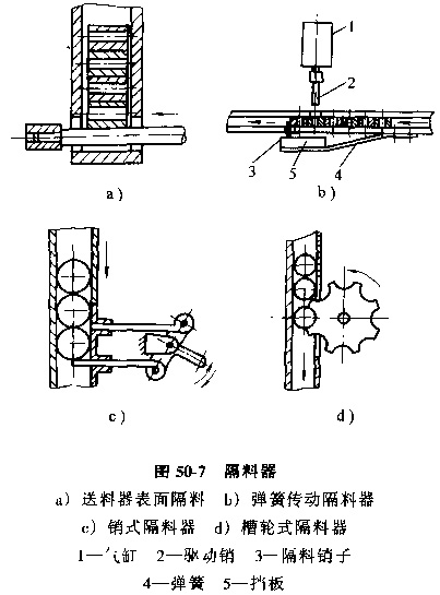50-7a為利用直線往復(fù)式送料器的表面隔料。圖50-7b是利用氣缸和彈簧傳動的隔料器,隔料銷子在彈簧4作用下插入料槽,擋住工件,當氣缸1驅(qū)動銷2插入料槽將第二個件隔位時,其前端頂在擋板5上,使銷子退出料槽,將第一個工件放行。圖50-7c為機械傳動的銷式隔料器,圖50-7d為槽輪式隔料器。