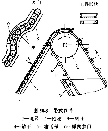 抓取法定向利用運動的定向機構(gòu)抓取工件的某些表面,。如孔、凹槽等,使之從成堆的雜亂工件中分離出來,并定向排列。圖50-8所示的帶式料斗,適用于碗狀、蓋狀和環(huán)狀零件的自動定向。裝有銷4的鏈帶1在連續(xù)運動時,堆在料斗3中的工件被銷子4掛住,依次送入輸送槽5,當槽5中料滿時,銷子1仍帶工件擠入槽5,槽上彎曲部分的彈簧蓋門6被打開,多余的工件落入外料箱。