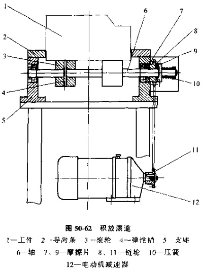 當轉(zhuǎn)軸與鏈輪、滾輪均采用剛性聯(lián)接時,傳送機屬于強制滾輪,即不論工件處于什么狀態(tài),在電動機運轉(zhuǎn)情況下,滾輪始終勻速轉(zhuǎn)動,此時如果工件被擋料器阻擋停下,滾輪與工件輸送面之間的滾動摩擦變?yōu)榛瑒幽Σ,會加大輸送面的磨損,這時對一些材質(zhì)較軟。用已精加工面作輸送面,或?qū)斔兔婢纫蟾叩墓ぜ螂S行夾具來說是不利的,因此,現(xiàn)在多采用積放式滾子傳送機,也就是滾輪與轉(zhuǎn)軸之間,或轉(zhuǎn)軸與鏈輪之間,不采用剛性聯(lián)接,而是靠摩擦傳動,見圖50-62。當正常輸送時,驅(qū)動力通過鏈條、鏈輪、滾輪、驅(qū)動工件,工件與滾輪間為純滾動,當工件被擋住時,滾輪與轉(zhuǎn)軸或轉(zhuǎn)軸與鏈輪之間的摩擦力小于工件與滾輪間的靜摩擦,工件與滾輪保持靜止,而滾輪與轉(zhuǎn)軸,或轉(zhuǎn)軸與鏈輪之間相對打滑,從而減少了對工件輸送面的磨損。采用滾輪與轉(zhuǎn)軸相對摩擦傳動的方式,結(jié)構(gòu)相對簡單。但滾輪與轉(zhuǎn)軸間磨損較快,對輸送精度和維修更換不利。采用鏈輪端面摩擦方式,可以通過彈簧調(diào)整摩擦力。較少摩擦片磨損的影響。維修更換都比較方便,但軸向尺寸需要加大。