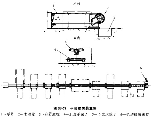 平帶輸屑裝置(見圖50-78)在自動線的縱向,用寬型平帶1貫穿機床中部的下方,平帶張緊在鼓形輪之間,切屑落在平帶上后,被帶到容屑坑3中定期清除。