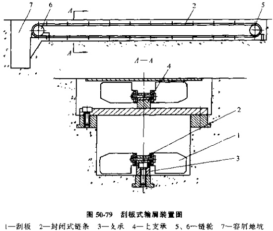 刮板式輸屑裝置(見表50-79)該裝置也是沿縱向貫穿自動線鋪設(shè),她可以設(shè)在自動線機床中間底座內(nèi)或自動線下方地溝里。封閉式鏈條2裝在兩個鏈輪5和6上,焊在鏈條兩側(cè)的刮板1將地溝中的切屑刮到深坑7中,再用提升器將切屑提起倒入小車中運走。