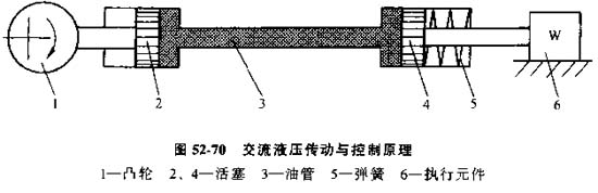 在這種控制系統(tǒng)中,凸輪1推動活塞2移動,活塞2又迫使油管3中的油液流動,從而推動活塞4和執(zhí)行機構(gòu)6移動,返回時靠彈簧5的彈力使整個系統(tǒng)回原位。執(zhí)行機構(gòu)的運動規(guī)律。由凸輪1控制。凸輪1是指令存儲裝置,同時又是驅(qū)動元件,由于在這種系統(tǒng)中,工作油液是在密封的管路中往復(fù)流動,故稱為交流液壓傳動。