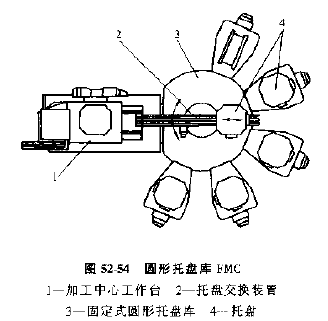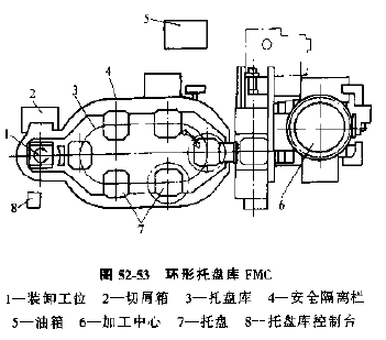 2) 圓環(huán)托板庫FMC,如圖52-54所示,其特點(diǎn)是托板庫是圓周分布,托板在裝卸工位,機(jī)床和托板庫各個(gè)位置之間輸送,通過庫中央的專門搬運(yùn)裝置實(shí)現(xiàn)托板的輸送。