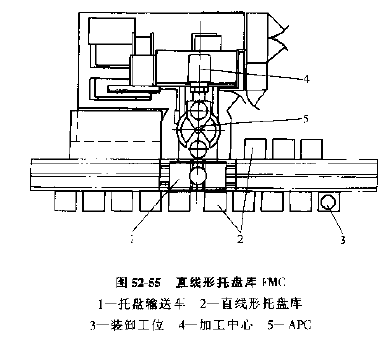 3) 直線形托板庫FMC,如圖52-55所示。相當(dāng)于上述的圓形托板庫展成直線形,托板輸送裝置常為有軌小車,這種單元的優(yōu)點(diǎn)是具有擴(kuò)展性,需要時(shí)可增加加工設(shè)備,加長(zhǎng)運(yùn)輸軌道和托板庫,擴(kuò)展成更大的FMC或其他柔性制造系統(tǒng)。