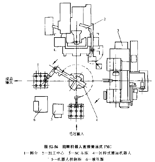 1) 回轉(zhuǎn)機(jī)器人直接搬運(yùn)的FMC(見圖52-56)由1~4臺(tái)車削中心或其他數(shù)控機(jī)床,以及固定安裝的回轉(zhuǎn)式機(jī)器人和工件存貯臺(tái)等組成,各設(shè)備都布置在機(jī)器人周圍或兩側(cè),工件在加工過程中的搬運(yùn)都由機(jī)器人自動(dòng)實(shí)現(xiàn)。