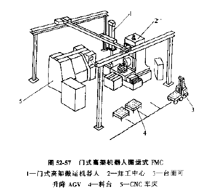 2) 龍門式機(jī)器人直接搬運(yùn)的FMC(見圖52-57)其特點(diǎn)是,可搬運(yùn)較大較重的零件和其他物料,搬運(yùn)設(shè)備不占場(chǎng)地。